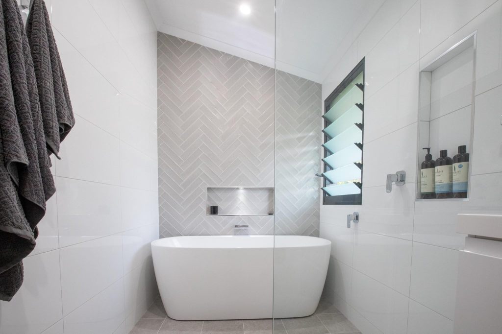 Tiling the full height of a room allows you to create an impact with a feature tile. Whether it is a subway or mosaic tile the feature can really pop a bathroom and add to a small bathroom without spending the earth. This small bathroom renovation below is an wet room renovation we completed in Glen Innes that a stunning grey herringbone.