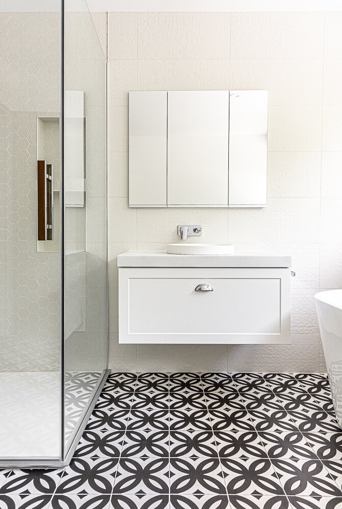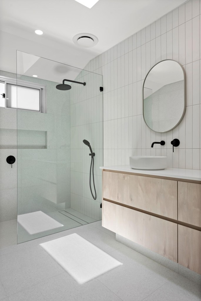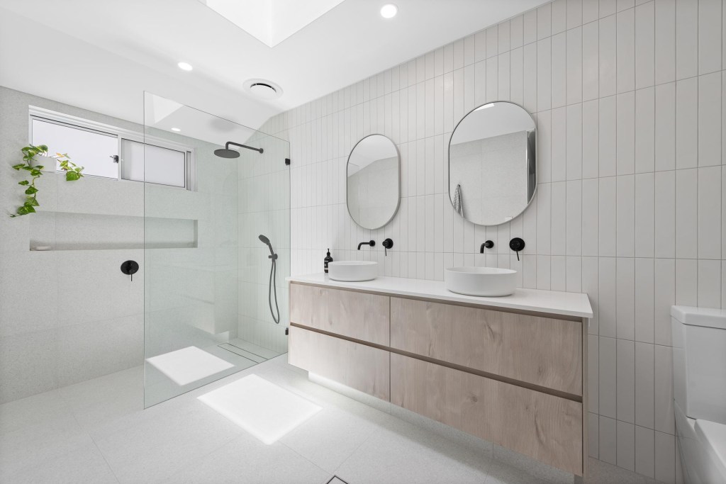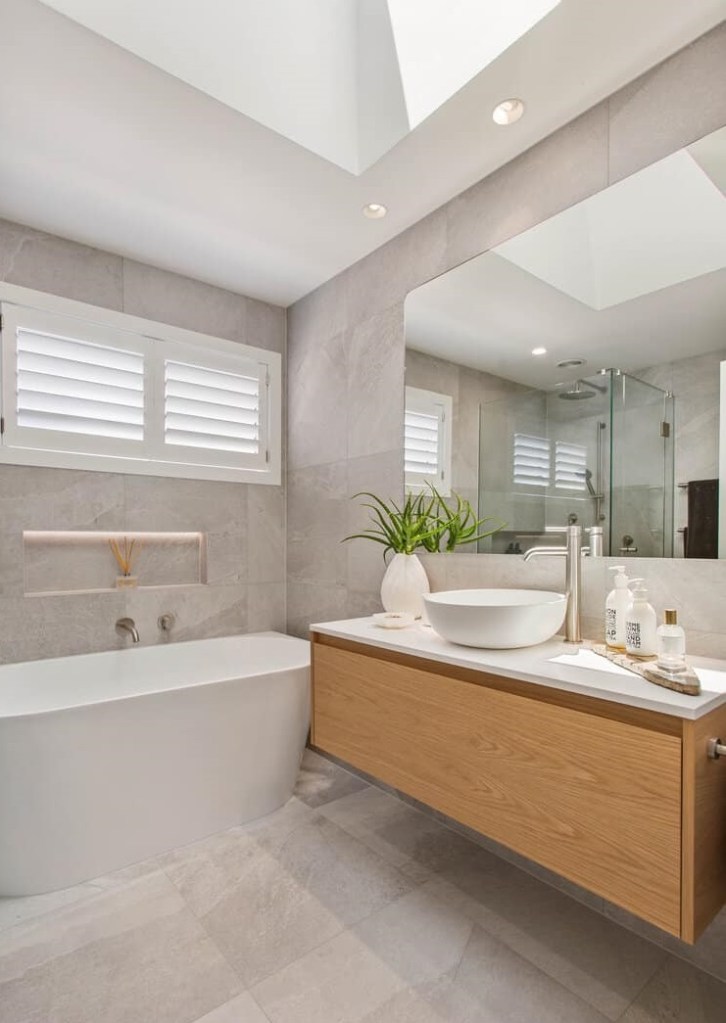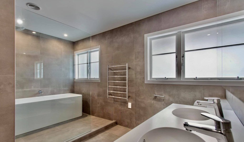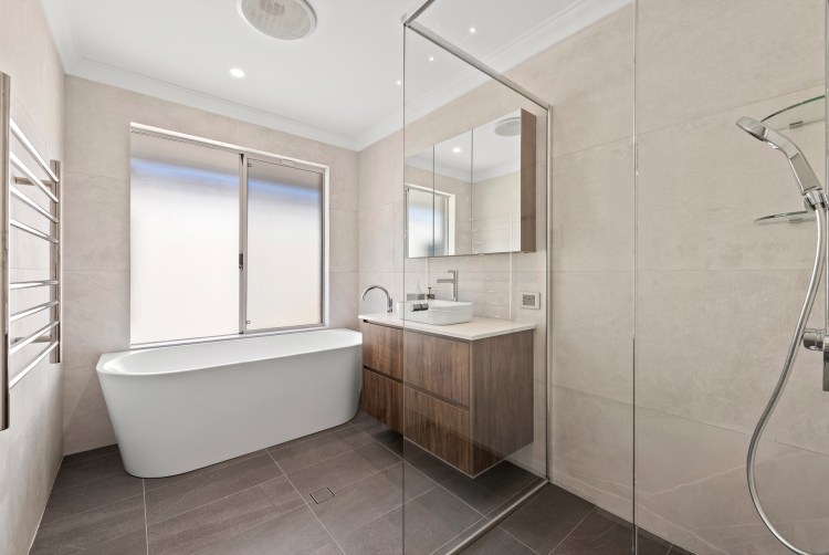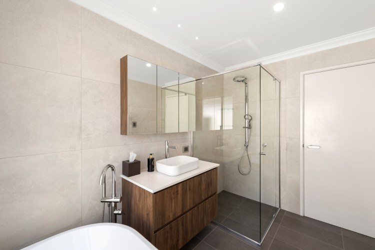 These bathroom renovations are what you call the traditional classic bathroom you get in Australia, which is the shower, vanity and bath all on the same wall. In this layout we now use freestanding baths for the more adult user.